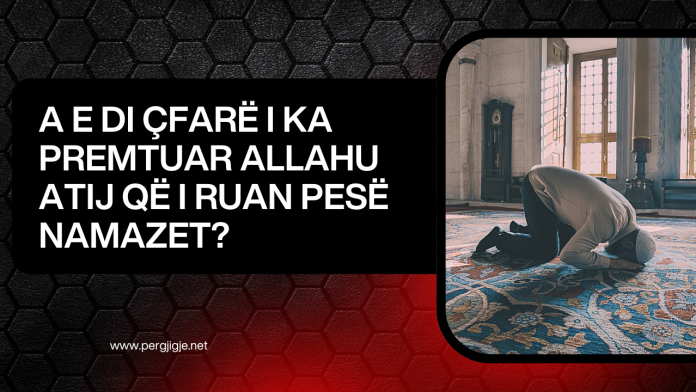 I Dërguari i Allahut, Muhamedi صلى الله عليه وسلم ,ka thënë: “Allahu i Madhërishëm ka thënë: “Unë ia kam bërë detyrë umetit tënd pesë namaze dhe kam dhënë besën se, kushdo që i ruan ato, duke i falur në kohën e tyre, do ta fus në Xhenet, kurse për atë që nuk i ruan ato, nuk kam dhënë besë.” [E SHËNOJNË EBU DAVUDI DHE IBN MAXHE.]