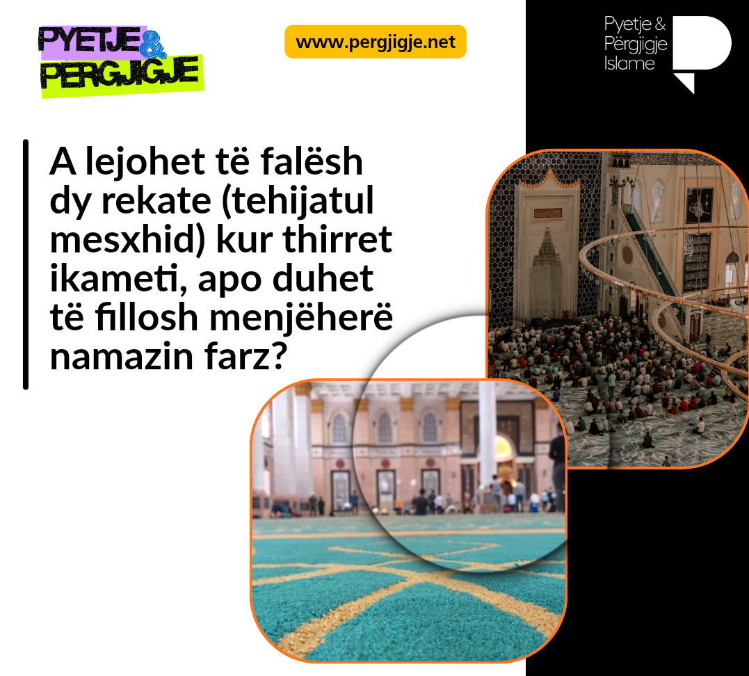 Pyetje: Shejkh i nderuar, Allahu të dhëntë sukses! Nëse hyjë në xhami ndërsa është duke u thirrur ikameti, a më lejohet që t’i fali dy rekate tehijatul mesxhid shpejtë dhe pastaj të bashkohem me xhematin?
