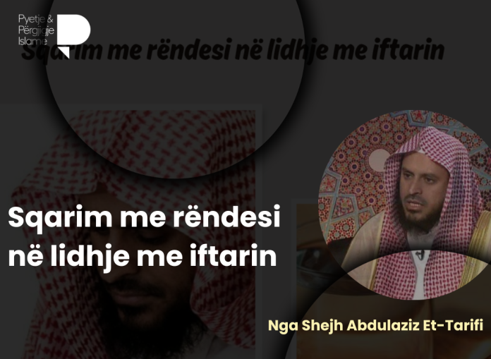“Kaloi etja, u lagën venat dhe nëse do Allahu u arrit shperblimi”. Nuk preferohet përkufizimi vetëm në këtë lutje, por (preferohet) të thuhen edhe lutje të tjera me të cilat iu drejtohemi Allahut për çështje të kësaj dhe botës tjetër. - Gjatë iftarit, nuk vërtetohet ndonjë lutje e caktuar, drejtimi nga kibleja apo ngritje duarsh nga Muhamedi, sal-lallahu alejhi ue selem.